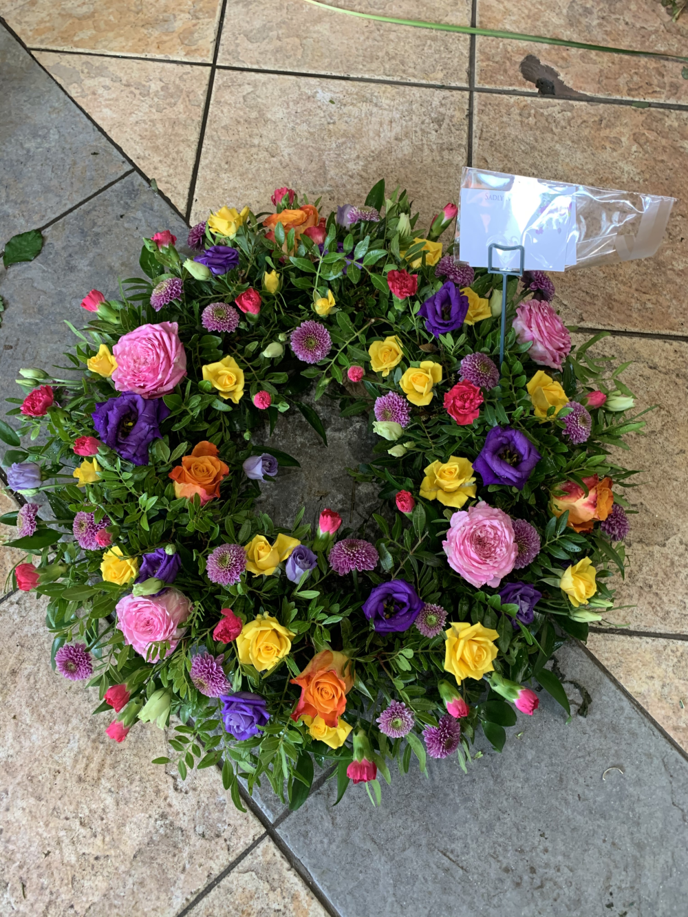 A classic wreath arranged using vibrant mixed flowers.