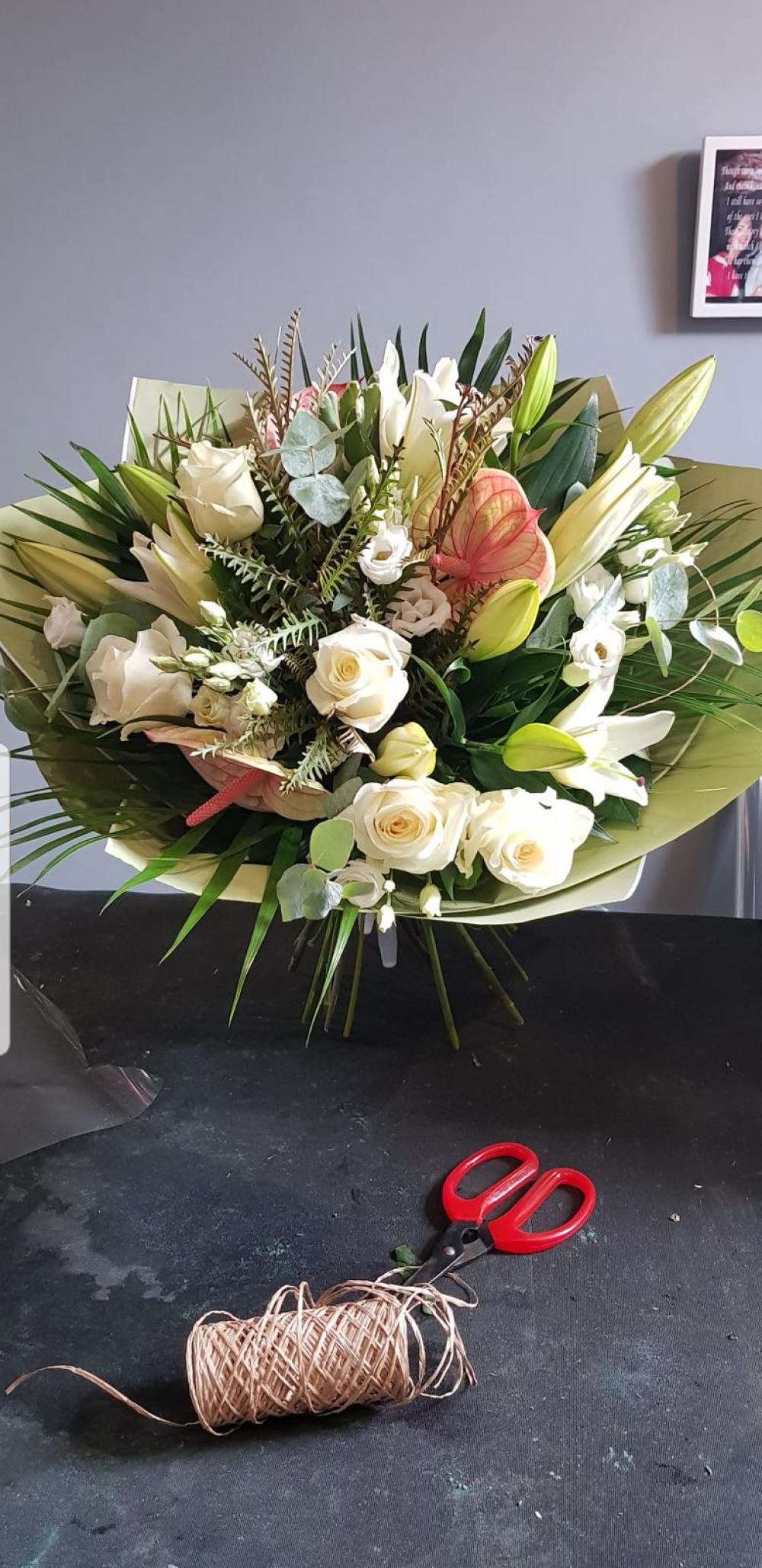 Eco friendly bouquet to incude white roses, lillies, lisianthus and calla lillies with beautiful foiage