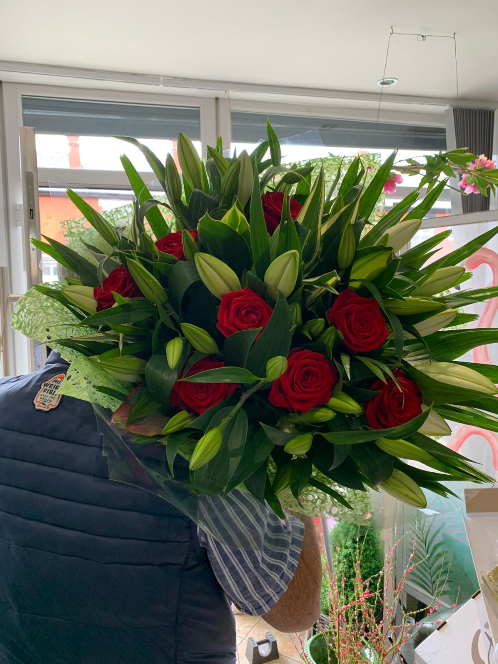 Eco friendly romantic handtie in water. Red roses and white lillies with lush green foliage